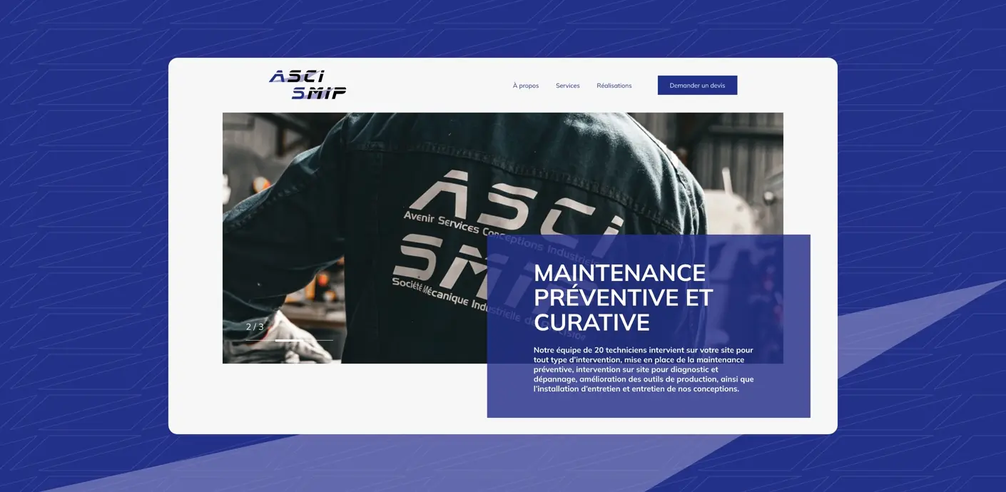 Le nouveau site vitrine d'ASCI-SMIP offre une expérience utilisateur améliorée, une interface visuelle cohérente avec l'identité de la marque et une compatibilité accrue sur divers appareils. Les photographies professionnelles ajoutent une valeur significative en présentant l'entreprise de manière authentique et engageante. Ce projet renforce la présence en ligne d'ASCI- SMIP et soutient ses efforts pour attirer de nouveaux clients et partenaires.
