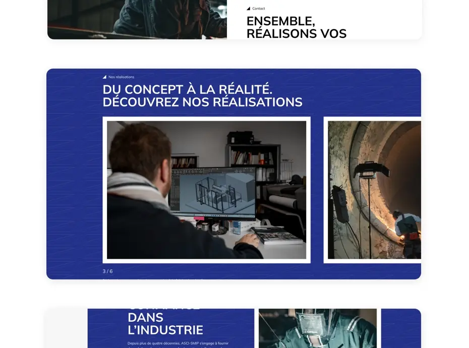 Tout au long du processus de conception, nous avons veillé à ce que le site reflète fidèlement les valeurs fondamentales d'ASCI-SMIP, telles que la fiabilité, l'expertise technique et l'engagement envers la satisfaction client. Les contenus ont été rédigés pour mettre en avant ces aspects, et les éléments visuels ont été choisis pour transmettre une image de solidité et de professionnalisme. - Réalisation de photographies professionnelles