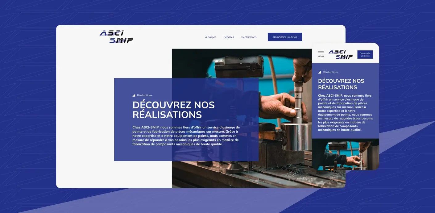 La conception visuelle du site a été élaborée pour refléter le professionnalisme et l'expertise d'ASCI-SMIP. Nous avons développé une charte graphique web en harmonie avec l'identité visuelle existante de l'entreprise, en utilisant une palette de couleurs sobres et professionnelles, des typographies lisibles et modernes, ainsi que des éléments visuels épurés. Cette cohérence visuelle renforce la crédibilité de la marque et offre une expérience esthétique agréable aux visiteurs. - Développement et design responsive
