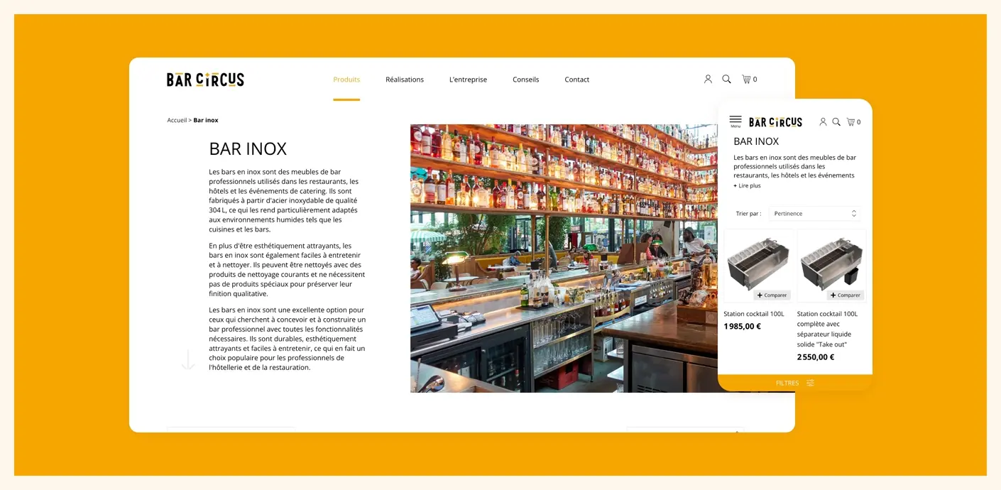 Bar Circus souhaitait moderniser sa présence en ligne en développant un site e-commerce performant, reflétant son savoir-faire et facilitant l'accès à son catalogue de produits pour les professionnels. Les objectifs principaux étaient :