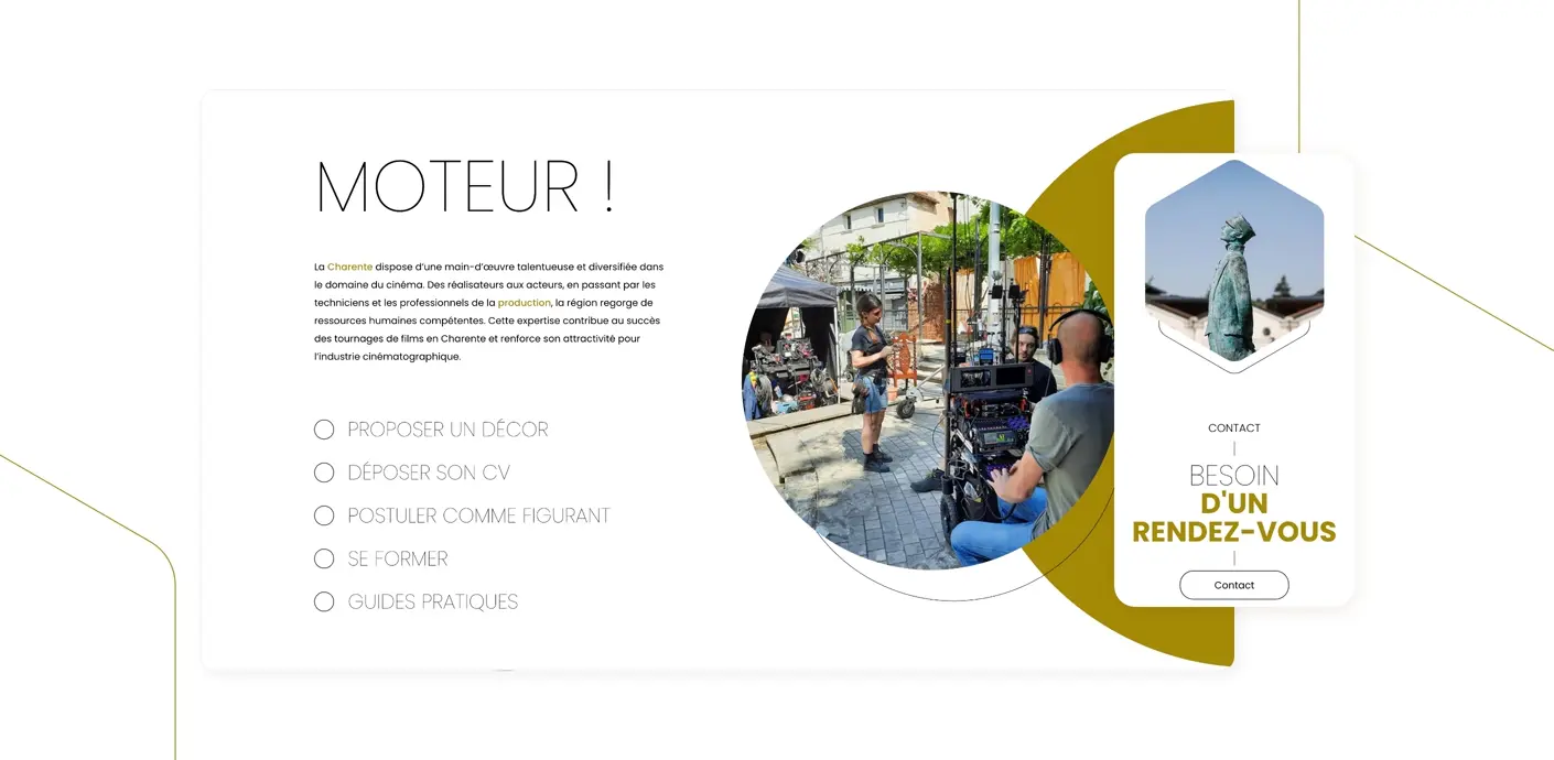Dans ce cadre, Charente Tournages a été créé pour valoriser le département comme une destination de tournage privilégiée. Son rôle est de mettre en relation les productions avec les talents locaux, de faciliter l’accès aux décors et de structurer l’offre audiovisuelle du territoire. Mandatés par Magelis, nous avons conçu un site vitrine intuitif et efficace, destiné aux professionnels du cinéma et de l’audiovisuel, leur permettant d’accéder rapidement aux ressources disponibles pour organiser un tournage en Charente.