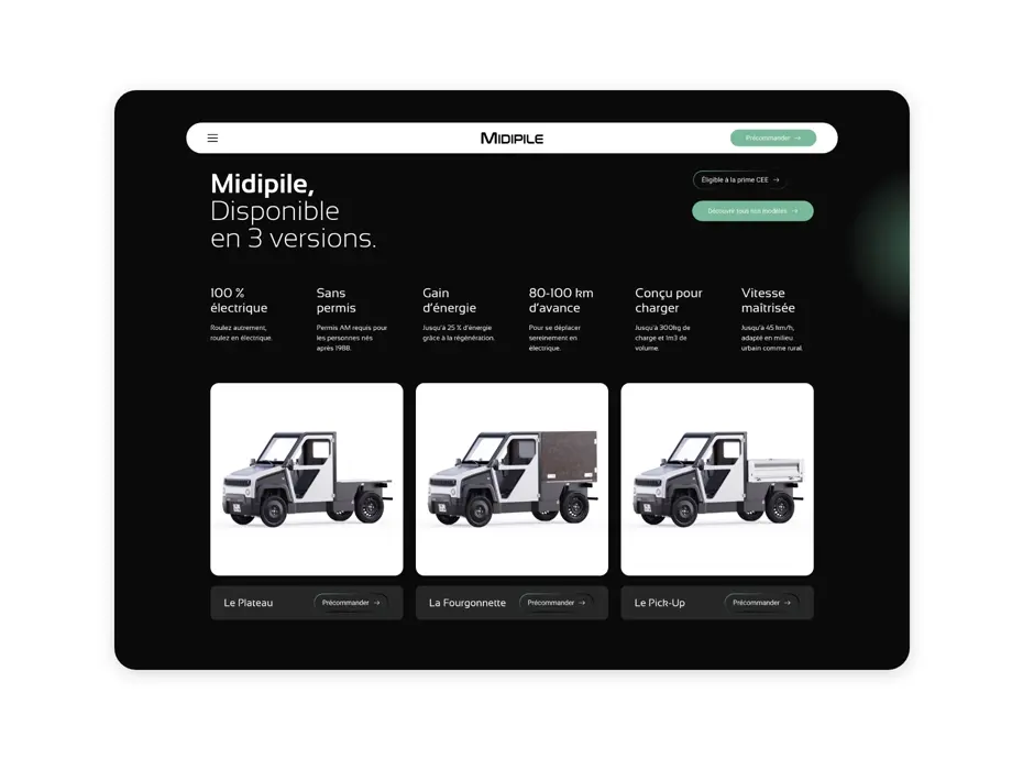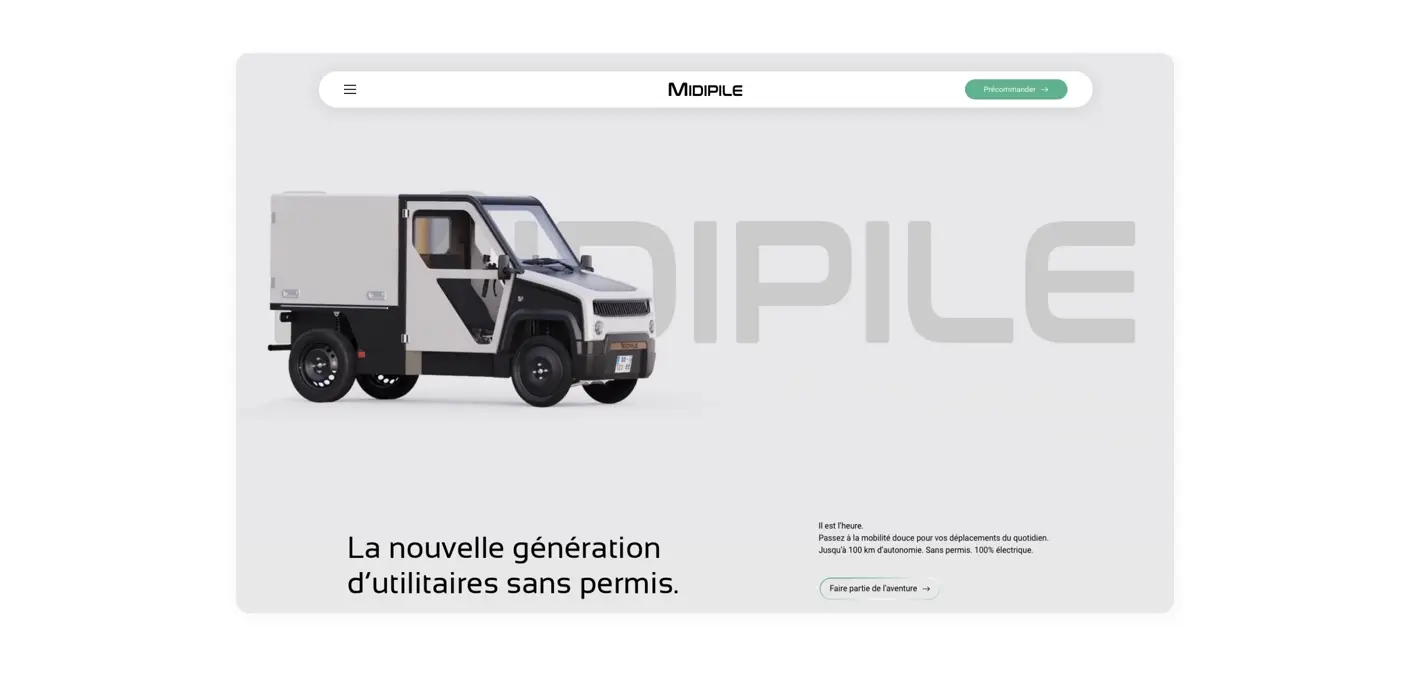 Son ambition : transformer le transport professionnel avec des véhicules à impact réduit, économes en énergie et facilement réparables. Dans ce cadre, MIDIPILE avait besoin d’une plateforme digitale moderne, élégante et performante, capable de répondre à plusieurs enjeux :