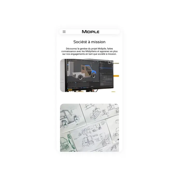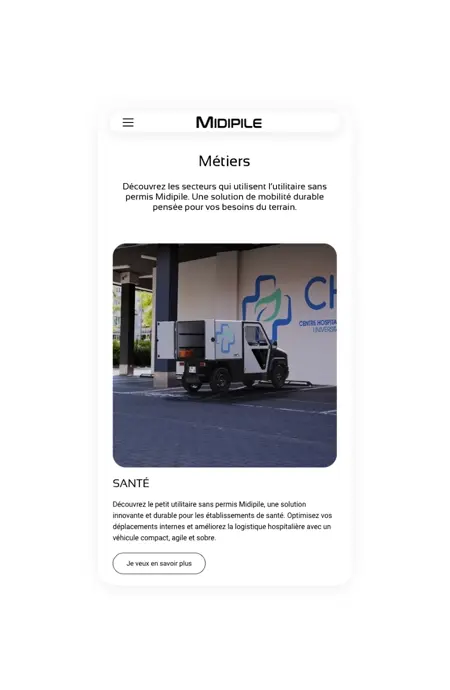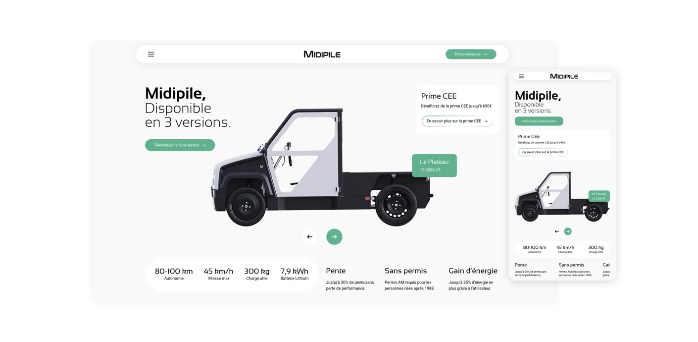- Une architecture optimisée pour le SEO, permettant à MIDIPILE d’être bien référencée sur les requêtes liées à la mobilité durable et aux véhicules utilitaires électriques.