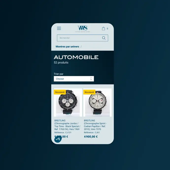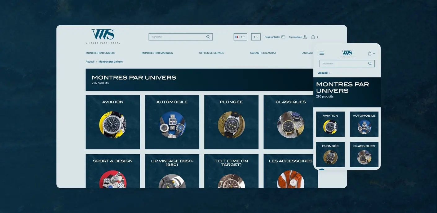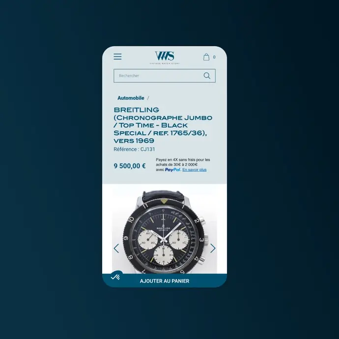 Vintage Watch Story (VWS) est une boutique en ligne spécialisée dans la vente de montres vintage et de collection. L’entreprise met en avant une sélection unique de montres iconiques, soigneusement sélectionnées pour leur authenticité, leur histoire et leur excellence horlogère. Avec un public exigeant et passionné, VWS nécessitait un site e-commerce haut de gamme qui reflète son positionnement premium et offre une expérience utilisateur fluide et intuitive, répondant aux standards de l’UX et de l’UI dans le domaine du luxe.