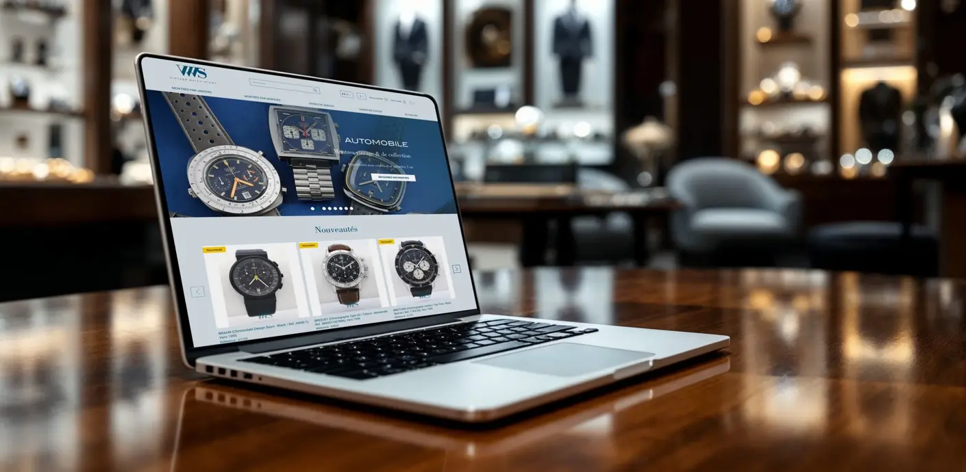 Le site e-commerce de Vintage Watch Story a été conçu comme une vitrine digitale d’exception, mettant en avant l’authenticité et la rareté des montres proposées.